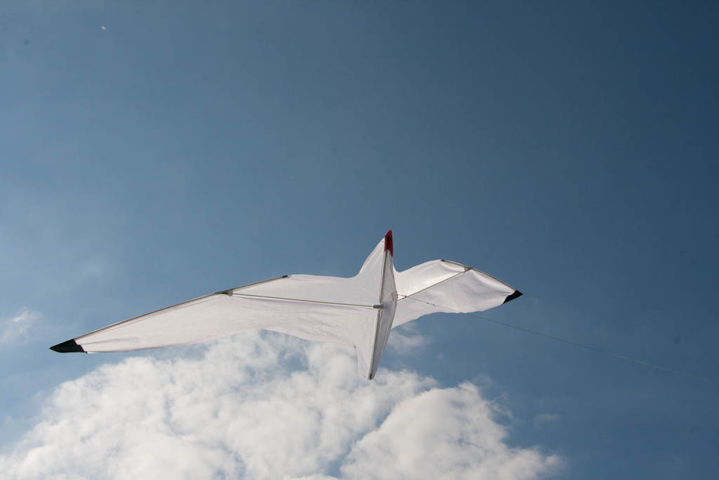 First kite build by my daughter Lisa. Copied from Seagull from Joost. Weinig wind nodig en kan best wel wat wind verdragen. Wordt door veel mensen voor een echte vogel aangezien. |